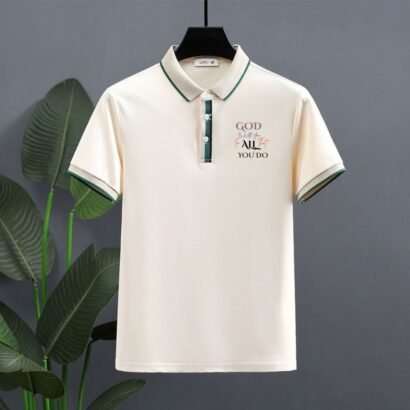The shirt features a refined collar with contrast detailing and stylish sleeve accents for a sleek look. On the chest, a custom inspirational print adds a meaningful touch, making it more than just a polo—it’s a statement of faith and confidence.